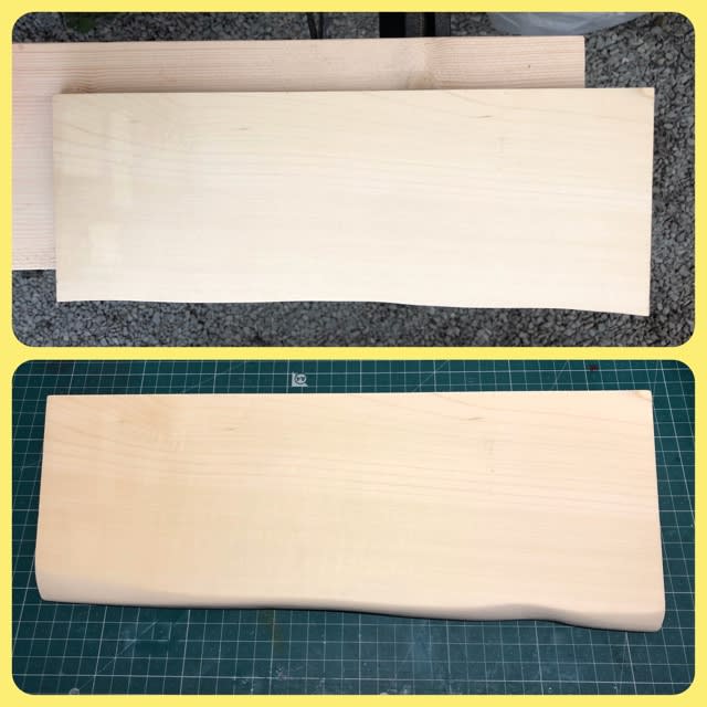 耳付きとラベルに書いてあり、何のこったちゃろとよく見ると一辺だけガリガリ削ってあり、四角四面の板に変化を持たせる加工がしてありましたが、ささくれだって荒っぽい仕上げだったので、削り込みを深めに、また全体をサンディングし直しました。