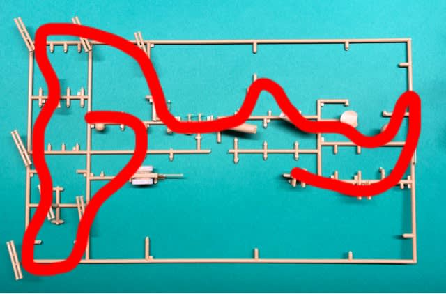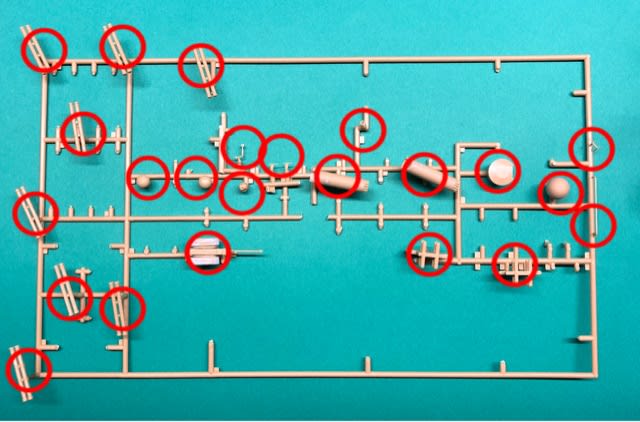 この○印の所にパーツがあります。それぞれ機体に接着する面を使って接着し、一気にサフ吹きが出来るように寄せています。