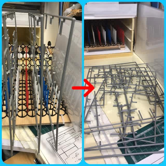 以前、『神ヤス』の整理収納に使ったDAI☆Oのセクションケースを利用して、取説の進行順にパーツを切り出し、個別の枠に分けて入れています。仕切り板が着脱出来るので、パーツの大きさによって枠の広さを変えられるのが便利です。まだ荒取りしたばかりで、パーティングライン処理はまだですが、段取りがつけ易くなりました。