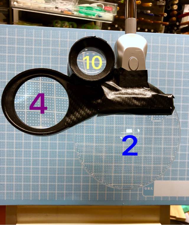 2倍でちと物足りなく感じたら4倍で、もっと寄りたいときは10倍と、対象物との距離は変わりますが、この組み合わせで細部工作に対応できるようになりました。
