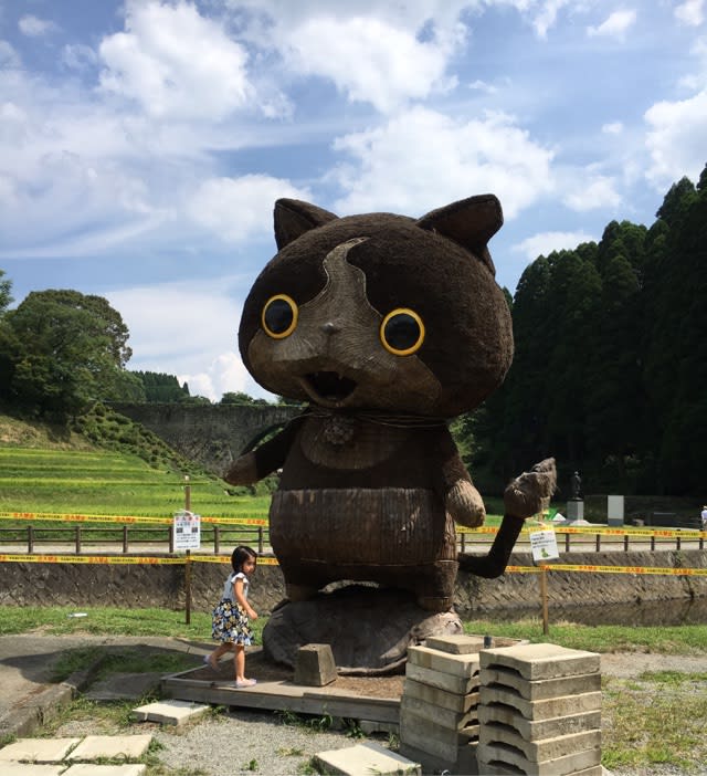通潤橋をバックに、妖怪ウォッチのキャラクターのおおつくりもんと、霊感あり過ぎのわたすぃにはザシキワラシも見える!←ボク、よかったねー。